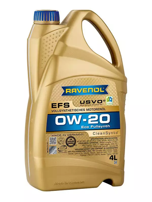 RAVENOL EFS 0W-20 je potpuno sintetičko, "fuel economy" (štedljivo gorivo) motorno ulje sa klasom viskoznosti SAE 0W-20, razvijeno CleanSynto® tehnologijom na bazi PAO (polialfaolefina), namenjeno modernim benzinskim i dizel motorima putničkih automobila (sa ili bez turbo punjača i direktnog ubrizgavanja), uključujući hibridne, sa ciljem minimalnog trenja, uštede goriva i produženih intervala zamjene. Specifikacija: ACEA C5, ACEA C6, API SQ (RC), ILSAC GF-7A, API SQ Resource Conserving, BMW Longlife-17 FE+, ILSAC GF-7A, MB-Freigabe 229.71, MB-Freigabe 229.72, VOLVO VCC RBS0-2AE 0W-20 - Service Fill, Chrysler MS-13340, Geely, Honda, Lynk & Co, Mazda, Nissan, Opel OV 040 1547 - A20, Polestar, PSA B71 2010, Suzuki, Toyota, VOLVO