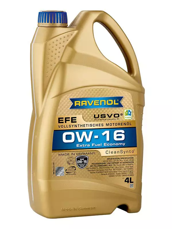 RAVENOL Ekstra Fuel Ekonomi EFE SAE 0W-16 je potpuno sintetičko motorno ulje sa niskim koeficijentom trenja na bazi PAO (polialfaolefina) sa posebnom USVO® i dokazanom CleanSynto® tehnologijom za benzinske motore putničkih automobila sa i bez turbo punjenja i direktnog ubrizgavanja. Zahvaljujući USVO® tehnologiji postižemo izuzetno visoku stabilnost viskoznosti. Izbegavamo nedostatke polimernih poboljšača viskoznosti dok istovremeno koristimo njihove prednosti. Ovo poboljšava zaštitu motora, performanse, čistoću motora i intervale zamene ulja. USVO® tehnologija omogućava da proizvod nema gubitaka smicanja tokom celog intervala zamene i izuzetno je stabilan na oksidaciju. Ova jedinstvena tehnologija pomaže bržem podmazivanju ulja, čime se minimizira trenje, a motor se održava čistim i efikasnim. RAVENOL Ekstra Fuel Ekonomi EFE SAE 0W-16 se preporučuje posebno za hibridna vozila. RAVENOL Ekstra Fuel Ekonomi EFE SAE 0W-16 je formulisan sa trinuklearnim molibdenom i OFM (organskim modifikatorima trenja), kako bi se postiglo minimalno trenje, habanje i potrošnja goriva uz odlične karakteristike hladnog starta. Sa svojom novom formulacijom, RAVENOL Extra Fuel Economy EFE SAE 0W-16 pruža siguran sloj podmazivanja čak i na veoma visokim radnim temperaturama i štiti od korozije i gubitka ulja usled oksidacije ili koksovanja. Odlično ponašanje pri hladnom startu obezbeđuje optimalnu bezbednost podmazivanja tokom faze hladnog rada. Značajnim smanjenjem potrošnje goriva, RAVENOL Extra Fuel Economy EFE SAE 0W-16 pomaže u zaštiti životne sredine smanjenjem emisija. RAVENOL Extra Fuel Economy EFE SAE 0W-16 minimizira trenje, habanje i potrošnju goriva uz odlične karakteristike hladnog starta. Produženi intervali zamene ulja prema uputstvima proizvođača. Specifikacija: API SQ (RC), ILSAC GF-7B, API SQ Resource Conserving, ILSAC GF-7B, Honda 08215-99974, Honda 08216-99974, Honda 08232-P99S1LHE, Honda Ultra Green, Honda Ultra Next, Mitsubishi Dia Queen ECO Plus, Mitsubishi MZ102661, Mitsubishi MZ102662, Nissan KLANM-01A04 Extra Save X Eco Hybrid Engine, Renault AN2022, Toyota 08880-11005, Toyota 08880-13105, Toyota 08880-83889