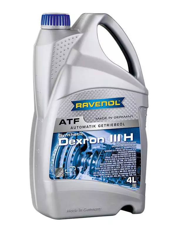 RAVENOL ATF DEXRON III H je sintetičko ATF (ulje za automatske mjenjače), dizajnirano na bazi visokokvalitetnih hidrokreking ulja sa posebnim aditivima i inhibicijom, koji obezbeđuju besprekornu funkciju automatskog menjača. RAVENOL ATF DEXRON III H je univerzalno ATF (ulje za automatske mjenjače) za sve automatske mjenjače sa i bez kontrolisanog kvačila za blokiranje konvertora obrtnog momenta (tzv. GKÜB = brzina-kvačilo-blokada) koje su potrebne za ulje za mjenjač tipa Dexron III H. Napomena o primjeni RAVENOL ATF DEKSRON III H je razvijen za upotrebu u automatskim mjenjačima sa elektronski kontrolisanim kvačilom za blokiranje konvertora. RAVENOL ATF DEKSRON III H je posebno pogodan za upotrebu u mjenjačima sa ATF Dexron III H specifikacijom. RAVENOL ATF DEKSRON III H je kompatibilan sa prethodnim standardima i može se koristiti u mjenjačima sa specifikacijom ATF Dexron F III. RAVENOL ATF DEXRON III H se može miješati sa svim brendovima ATF. Preporučuje se ispiranje sa RAVENOL ATF DEXRON III H pre, prije nego što se izvrši završno punjenje sa RAVENOL ATF DEXRON III H. Specifikacija: Allison C4-32642009 (ATF III H), Allison TES-389 AA-33072010 (ATF III H), Voith H55.6336.3x Extended Drain (G1363), ZF TE-ML 04D (ZF001609), ZF TE-ML 14B (ZF001609), ZF TE-ML 20B (ZF001609), ZF TE-ML 25B (ZF001609), Caterpillar TO-2, DTFR 13C100 (MB 236.1), DTFR 13C170 (MB 236.9), Ford MERCON® M-940717, MAN 339 L1, MAN 339 V1, MAN 339 Z1, MAN 339 Z2, MB 236.1, MB 236.10, MB 236.5, MB 236.6, MB 236.9, Nissan, VOLVO 1161521, VOLVO 1161621, VOLVO Transmission Oil 97341, ZF TE-ML 02F, ZF TE-ML 03D, ZF TE-ML 05L, ZF TE-ML 14A, ZF TE-ML 16L, ZF TE-ML 16R, ZF TE-ML 17C