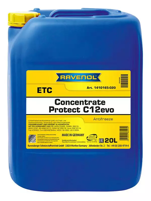 Ravenol ETC (Easy To Cool/Electronically Controlled Termostat) Concentrate Protect C12evo je dugotrajni, ekološki antifriz i rashladna tečnost najnovije generacije, zasnovana na Si-OAT tehnologiji (kombinacija organskih kisjelina i mineralnih silikata). Pruža vrhunsku zaštitu od korozije, smrzavanja i pregrijavanja bez upotrebe borata, nitrita, fosfata i 2-etilheksanske kisjeline. Koristi se u rashladnim sistemima motora sa unutrašnjim sagorjevanjem (automobili, teretna vozila). Koristi Si-OAT (Organic Acid Technology sa silikatima) za dugotrajnu zaštitu od rđe i kavitacije. Specifikacija: ASTM D3306, ASTM D4985, ASTM D6210, BMW LC-87, BS 6580:2010 (GB), Cummins CES 14603, CUNA NC 956-16 (Italien), Deutz DQC CC-14, DTFR 29C100 (MB 325.0), DTFR 29C120 (MB 325.5), Fiat 9.55523, Ford ESD-M97B49-A, IVECO 18-1830, JIS K 2234 (Japan), Liebherr LH-01-COL3A, MAN 324 NF, MAN 324 Si-OAT, MB 325.0 (Konzentrat), MB 325.5, MB 325.6, MTU MTL 5048, O Norm V 5123 (Österreich), SAE J1034, Scania TB 1451, VOLVO TR 1286083, VOLVO TR-31854114-002, VOLVO VCS-2, VW TL 774-L (entspricht G12evo)