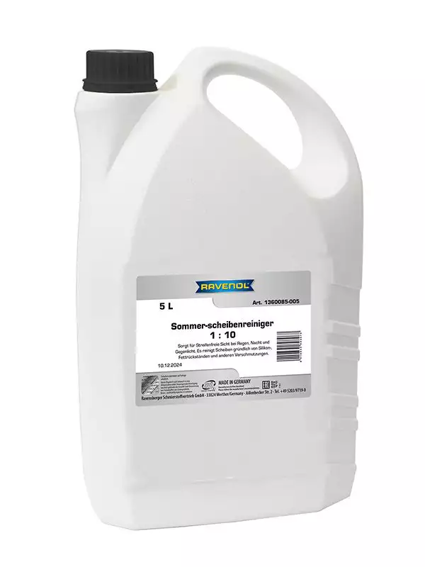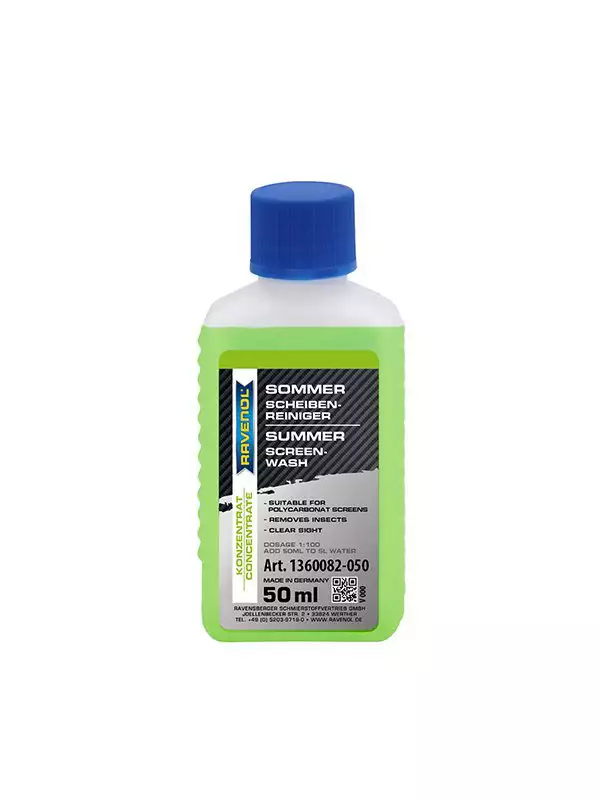 Ravenol Sommer-Scheibenreiniger (letnja tečnost za pranje stakla) je visokoefikasni koncentrat namenjen za čišćenje vjetrobranskih stakala i farova tokom letnjih mjeseci, proizveden u Njemačkoj. Efikasno uklanja insekte, masnoće, silikon i prljavštinu sa puta, pružajući stakla bez tragova (streaks) uz prijatan miris pomorandže ili jabuke. Dostupan u varijantama, najčešće 1:10 (koncentrat koji se meša sa vodom) ili 1:100 (visoki koncentrat).