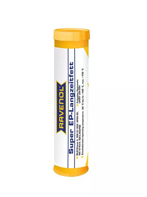 Ravenol Super EP-Langzeitfett je visokokvalitetna, dugotrajna višenamjenska litijumska mast namjenjena za podmazivanje teško opterećenih kliznih i kotrljajućih ležajeva. Sadrži EP (Extreme Pressure) aditive bez teških metala, pruža odličnu zaštitu od korozije i vlage, te je idealna za šasije, zglobove i ležajeve točkova u auto-industriji i industriji. Mineralna višenamenska mast na bazi litijumovog sapuna (Li-12-hidroksistearat). Izuzetna otpornost na vibracije, udarna opterećenja i vlagu. Koristi se u automobilima, kamionima, poljoprivrednim i industrijskim mašinama za podmazivanje ležajeva točkova i univerzalnih zglobova. Specifikacija: DIN 51502: KP2K-30, ISO 6743-9: ISO-L-XCCFB2